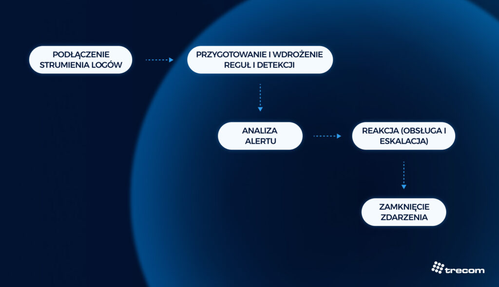 Na temat SOC pojawiło się już kilka artykułów na naszym blogu, które zdecydowanie każdemu polecam. Nie wchodząc w szczegóły, pracę tego zespołu (w bardzo dużym uproszczeniu) można opisać w kilku następujących krokach: