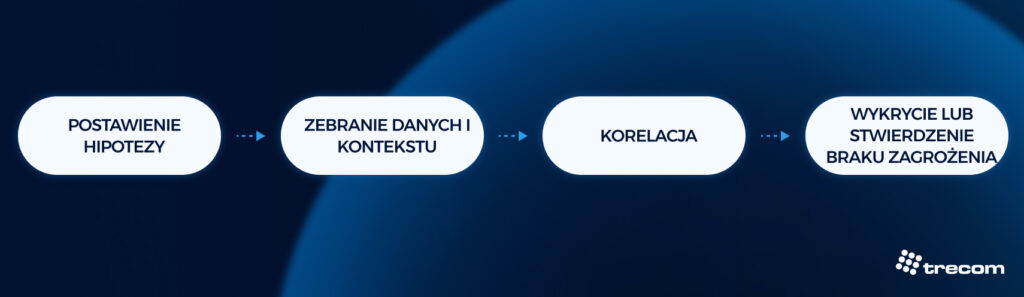 Threat Hunting działa w oparciu o budowanie hipotez na podstawie wskazań Cyber Threat Intelligence (CTI). W tym przypadku etapy działania mogą wyglądać następująco: