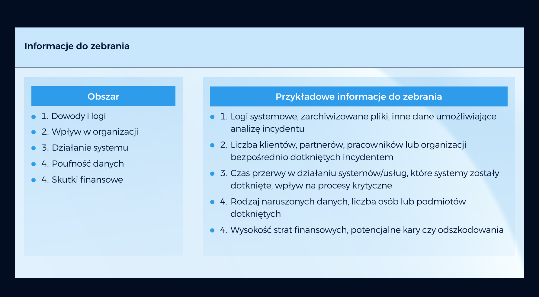 Istnieje szereg informacji, które warto zbierać i kategoryzować nie tylko z perspektywy compliance, ale również w celu zapewnienia efektywności procesu zarządzania incydentami. Są to m.in. :